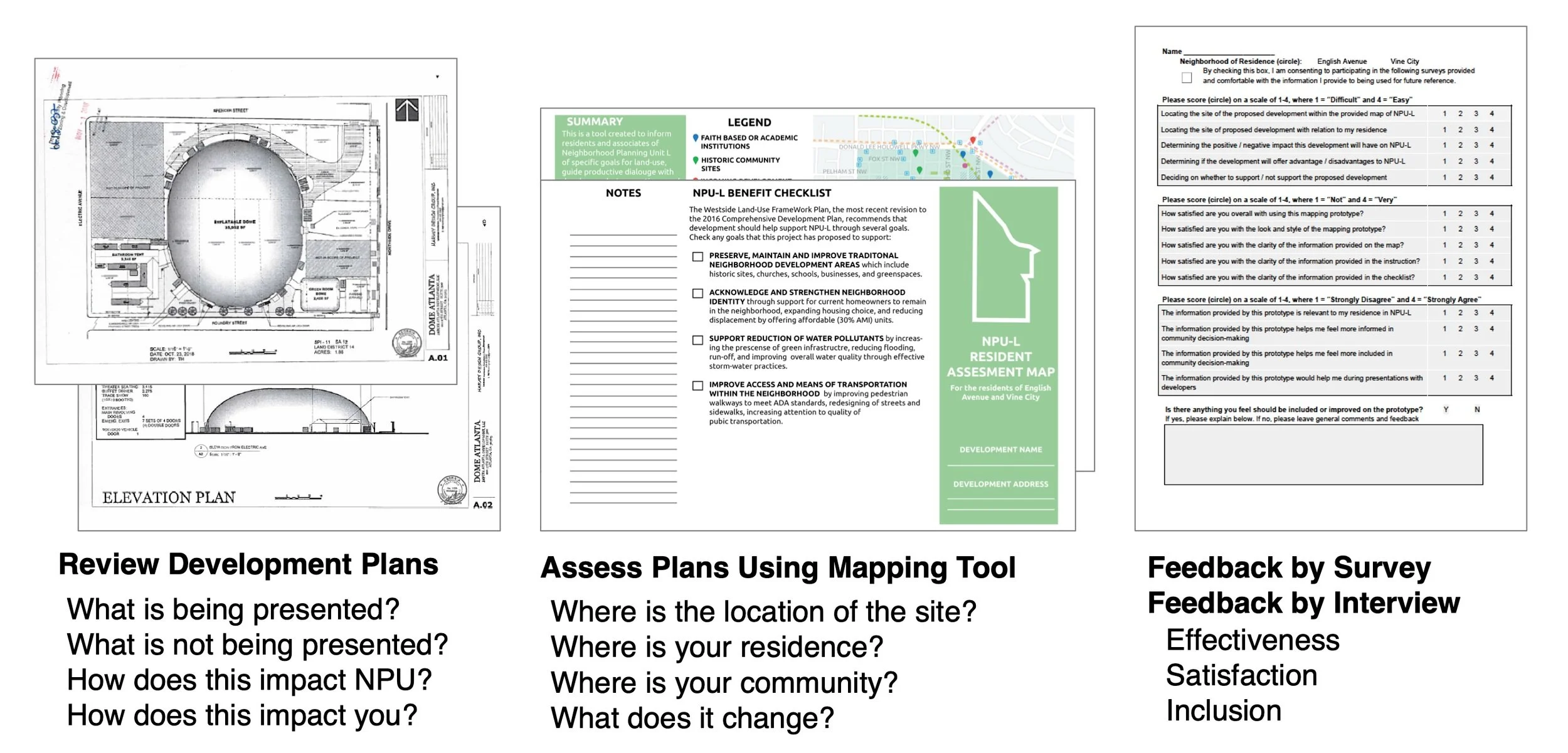 The “NPU-L Resident Assessment Map” is constructed as a tri-fold pamphlet which provides interactive instructions for residents to place their residence – and any development being proposed in a meeting – on an asset map of the NPU-L neighborhoods. In the final iteration of this concept, the interior of this tool provided overlays of data relevant to the location of neighborhood landmarks, environmental concerns, employers, current and projected transportation routes, and the average median income. The exterior of this tri-fold provided a condensed outline of the NPU-L goals – sourced from their contribution to the 2016 Comprehensive Development Plan – and space for residents to collect additional information during their discourse with developers to help them consider any additional data that was not currently mapped. While the primary intent of providing this information was to equip residents with a visual product that could serve as the central focus of NPU deliberations – thereby forcing developers to ground the discussion of their proposal to the current-state geography and residential concerns held by current residence – this information provided a secondary focus of helping unify resident-to-resident in-meeting conversations around common civic language, internal goals, and geographically-specific concerns that were only noted verbally due to the lack of visual products in traditional meetings.